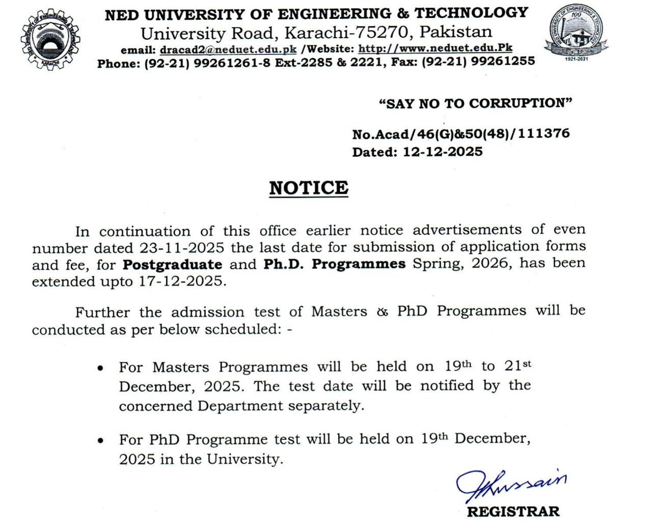 Notice - Extension in Submission of application forms and fee, for Postgraduate and Ph.D. Programmes, Spring 2025 December 13,2024