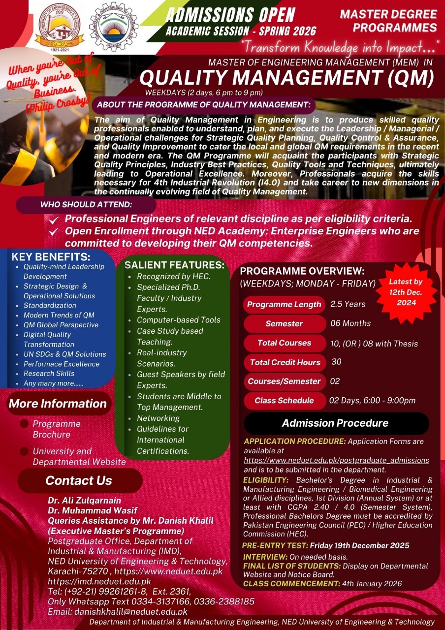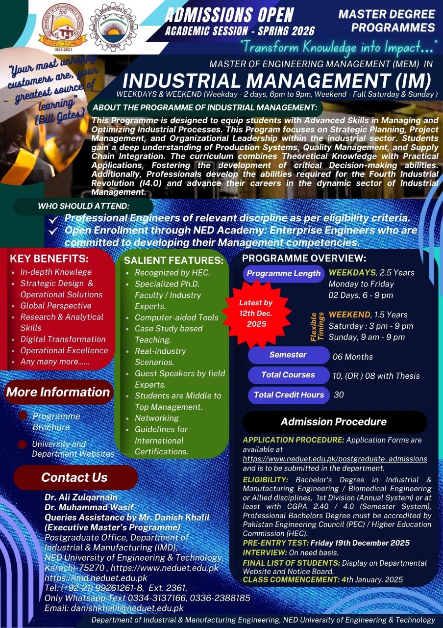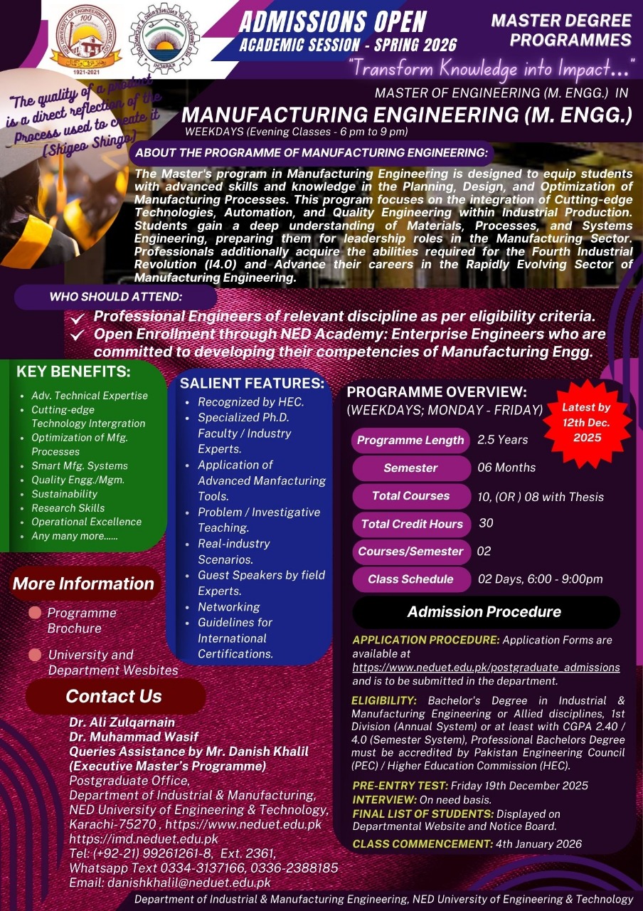 Admission schedule for Masters in Industrial & Manufacturing Engineering Programme