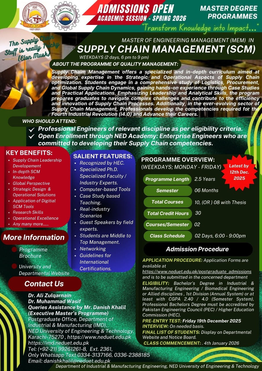 The Department of Industrial & Manufacturing is offering Master of Engineering (by course work) with the Specializations in Manufacturing Engineering and Engineering Management. The Engineering Management program further offers choices of Specialization in Industrial Management, Quality Management and Supply Chain Management. The Department of Industrial and Manufacturing Engineering has highly qualified and experienced regular and visiting faculty members.